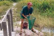 Reste enfin à attraper ces petits poissons, objets de tant de convoitises. Ma technique préférée sera l'utilisation d'une épuisette renforcée qu'on balance énergiquement dans les zones herbeuses qui longent les cours d'eau. Parfois, l'utilisation à vue d'une petite épuisette d'aquarium peut s'avérer efficace surtout de nuit, à la frontale, mais cette technique doit être réservée à des pécheurs particulièrement patients (ce fut assez rarement mon cas). Enfin, j'ai pu tester la technique de la pêche à la ligne avec, à mon grand regret, le constat que ce sont toujours les mêmes qui se font attraper : les yayas et les pirayes (les fameux piranhas).