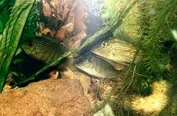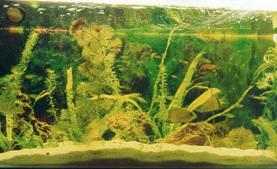 Mais pour moi, grand amateur de cichlidés, ce bac était trop " gentil ". J'ai finalement réussi à me procurer un couple de Heros appendiculatus pêché dans le bassin de la Comté. Ces poissons sont superbes et font parfois penser, de part les nombreuses lignes turquoises qui leurs agrémentent la tête et les flancs, à nos bons vieux discus. Mais, le caractère en est bien différent et l'animation tant attendue fut vite au rendez vous : les yayas étaient tous mangés ! !